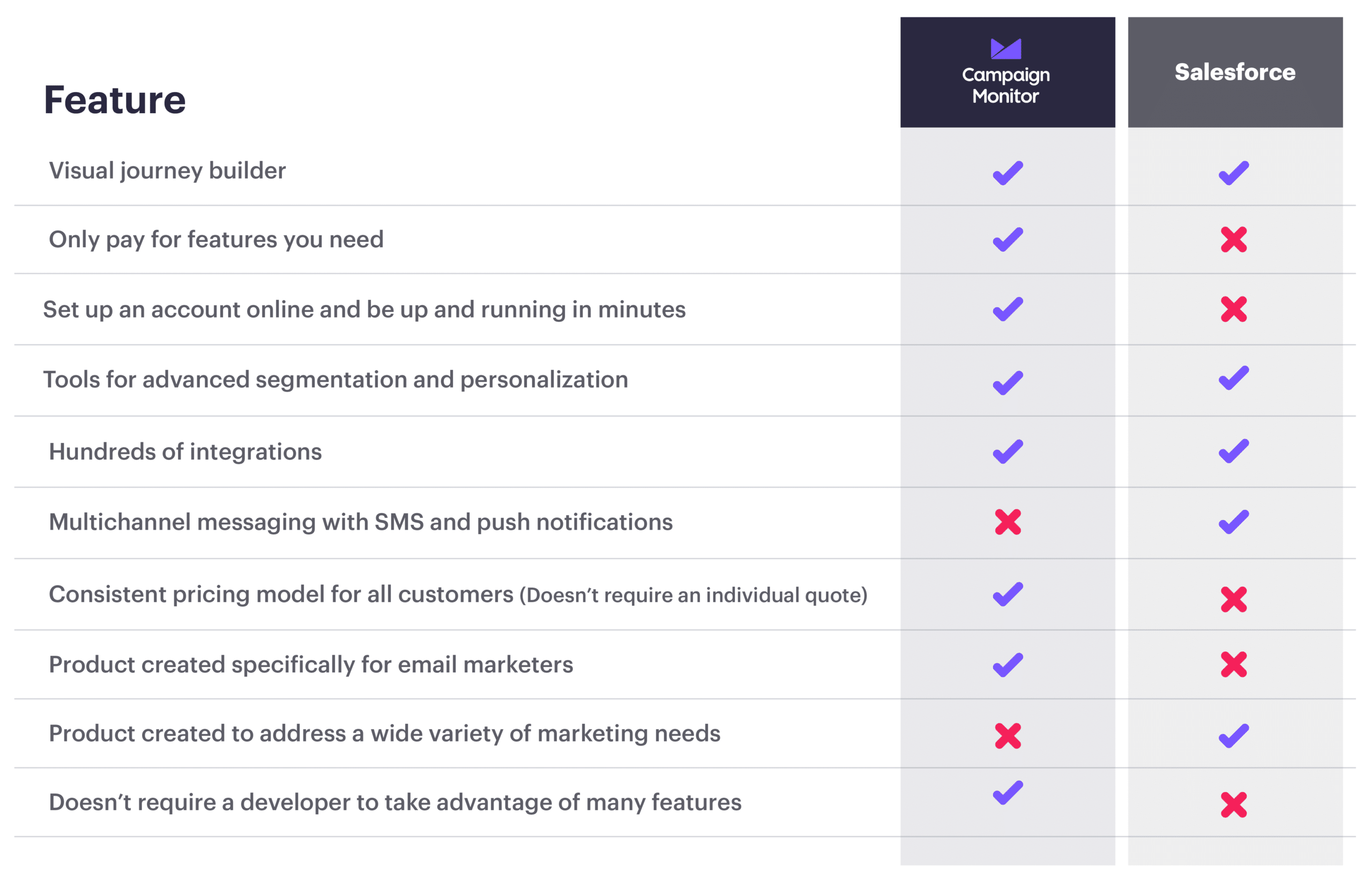 SubscribeWith so many available options for an email service provider, it can be hard to find the best one for your organization’s specific needs. We know marketers are busy and email marketing may be a very small piece of your day-to-day, which is why we’ve rounded up a side-by-side comparison of one of the most frequent questions we get asked: What’s the difference between Salesforce Marketing Cloud and Campaign Monitor?