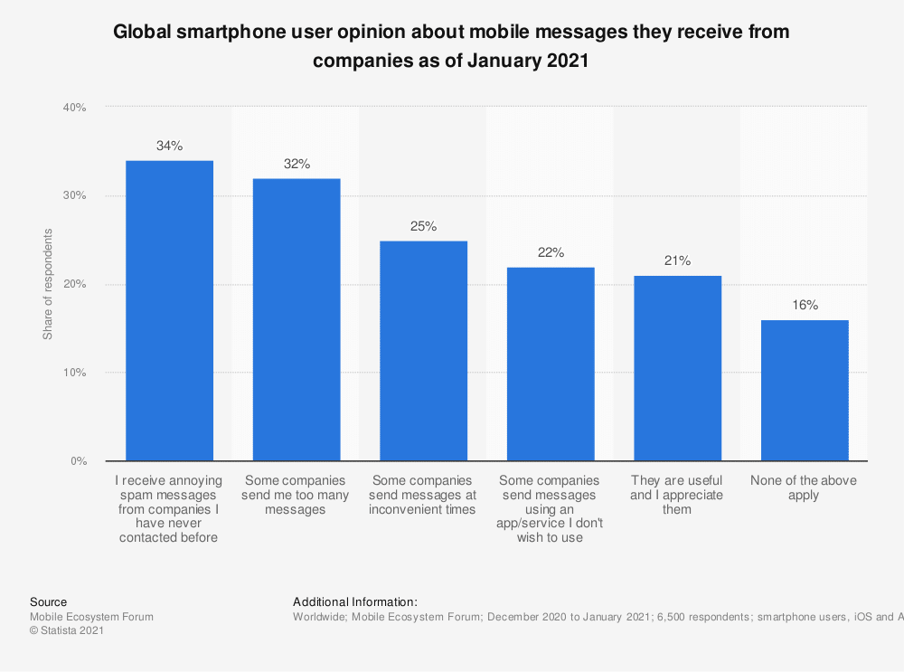 According to Statista, only 25% of smartphone users prefer getting business communication via text. This isn’t to say SMS is not a preferred channel, though. SMS marketing messages are second only to email (which is the preference of 46% of users, as noted above).