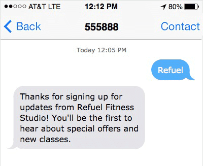 Getting opt-in from your audience can be as simple as asking them to take the lead by texting a keyword to sign up. Seen here is an example from Refuel Fitness, which asks its members to simply text “refuel” to sign up for SMS messages. Once the member signs up, Refuel Fitness confirms their subscription and reiterates the value they can expect to receive.