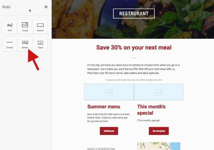 For example, if you want to change the color of an email button, hit the cog-shaped icon on the left side of the build menu. Then, simply change the button color and button text settings.