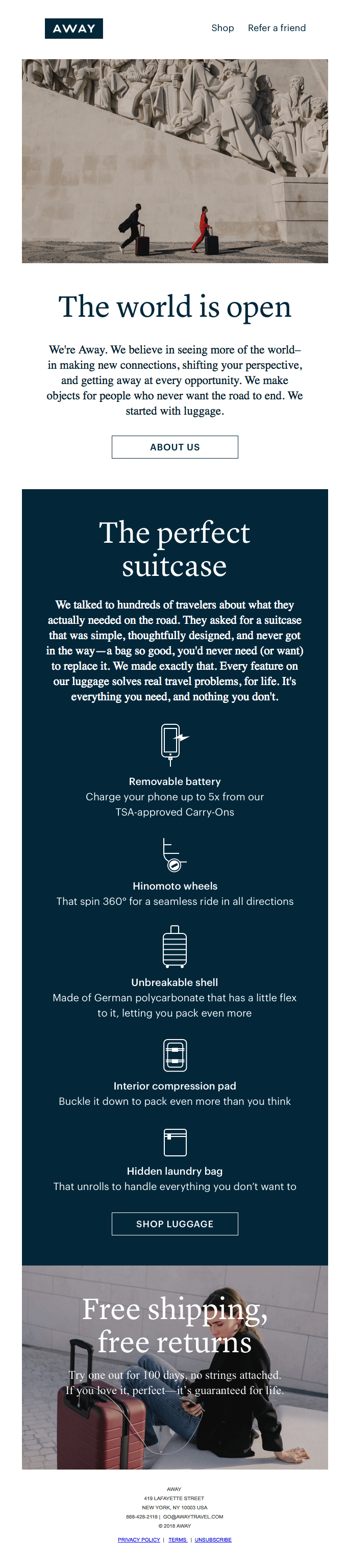Take a look at this example from Away. Away clearly demonstrates who they are, discusses the features of their luggage, and offers an incentive at the end.