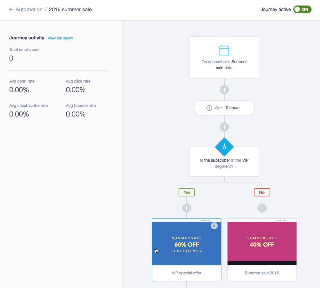Setting up an automated journey does take time but, once it’s turned on, your emails send themselves. It’s important to note that you can’t set up your campaigns and forget about them. You should check the status of your campaigns and alter your journeys as needed.