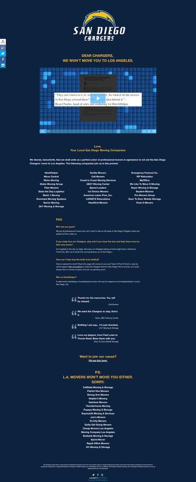 You don’t need to use social media to create a successful real-time marketing campaign. After the San Diego Chargers announced they were moving to Los Angeles, San Diego moving company HireAHelper created a website saying that, if the team tried to hire them to help move, the company would say no.