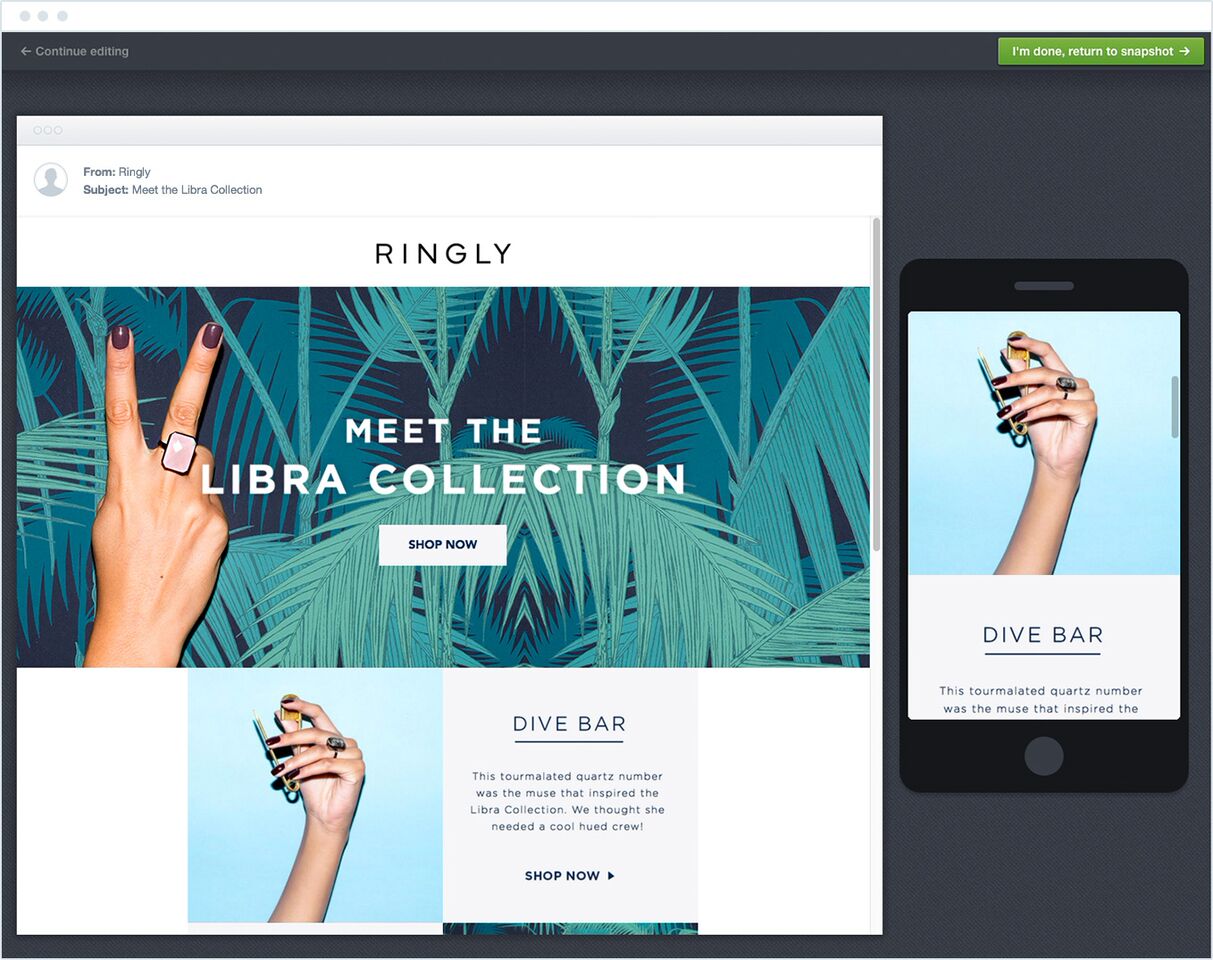 The first step in making your emails mobile-friendly is to use a responsive email template. Responsive templates are coded to respond and adapt to the screen on which the email is being read. Thankfully, you don’t have to do any coding yourself.