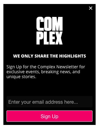 After cruising the Complex website, a signup form appears from the bottom of the screen, encouraging you to sign up. This signup form is not as invasive as a full-screen pop-up, but still draws readers’ eyes and encourages them to sign up for emails.