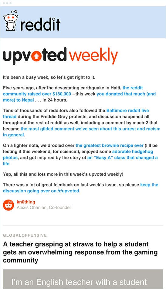 Reddit is an entertainment, social networking, and news website for the masses, and it’s filled to the brim with content. It can be difficult to parse through reddit to find interesting articles, so the website delivers Upvoted Weekly, their newsletter with the best of reddit for those who may have missed it.