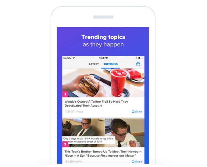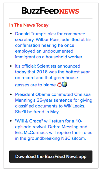BuzzFeed offers a BuzzFeed News app to help readers stay on top of current events and issues in the world today. To the right of each news article, they share a bulleted list of the biggest stories in the news today.
