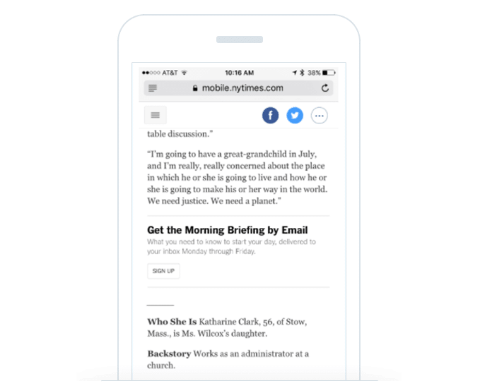 For example, The New York Times reminds readers to sign up for their morning briefings midway through articles. This is particularly compelling on a mobile phone, where the ask is shown in the center of the screen.