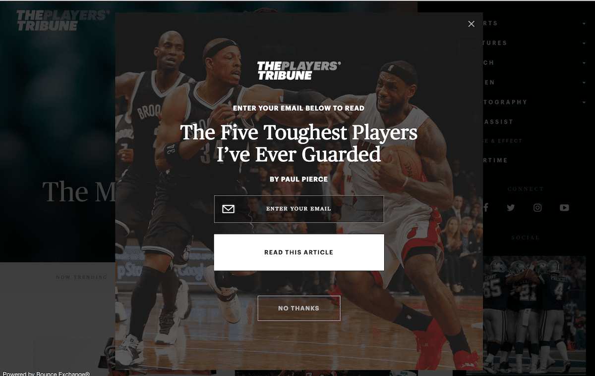 The Player’s Tribune creates sports-related content for die-hard fans. Rather than asking visitors to sign up for a generic daily update, the media company has created email series, such as “The Five Toughest Players I’ve Ever Guarded” by Paul Pierce.