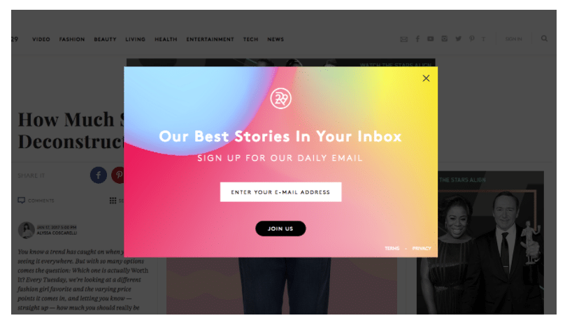 Refinery29, a fashion, beauty, and lifestyle company, promotes articles such as “How to Shop For Boyfriend Jeans If You’re A Skinny-Jeans Girl.” To gain loyal readership, Refinery29 heavily promotes its daily emails while reading an article.