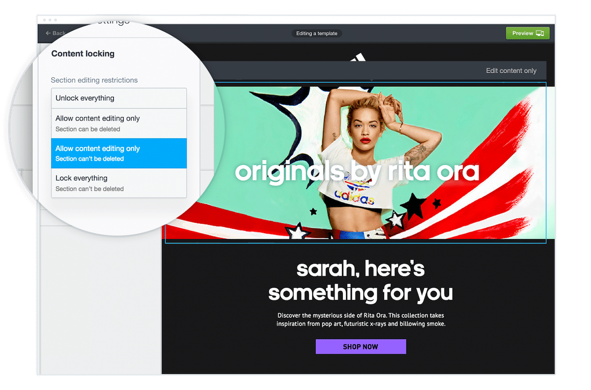 Email template management for teams can be extremely helpful, as this feature allows you to create templates, but lock certain aspects so that editors can’t accidentally edit a logo, social media button, or other important email feature or content.
