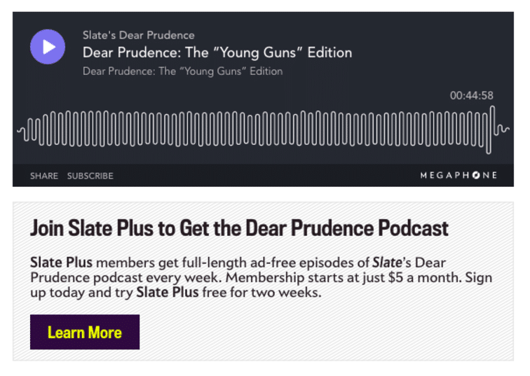 For example, Slate provides even more podcasts and offers to those who become paying Slate Plus members. Not only do the podcasts offer great content, but the paid Slate Plus option also provides Slate with an opportunity to generate revenue.